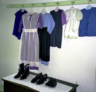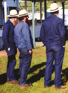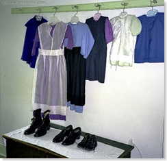 Los hombres suelen llevar trajes de colores oscuros y sombreros de ala ancha negros o de paja. Las mujeres no pueden llevar joyas, usan vestidos sencillos, de un sólo color, generalmente con mangas largas, una amplia falda, una cofia blanca y un delantal. No se cortan el cabello, que recogen en un moño en la parte trasera de la cabeza.