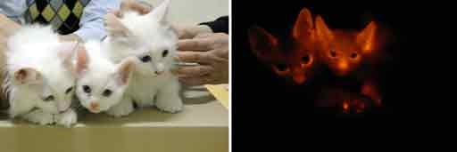 Los siameses, que son una copia genética de su padre, logran este increíble efecto gracias a una proteína que provoca una fluorescencia rojiza en todo su organismo: piel, pelo, músculos, cerebro, corazón, hígado, riñón, páncreas, pulmones, estómago, intestinos, lengua e incluso en sus excrementos.