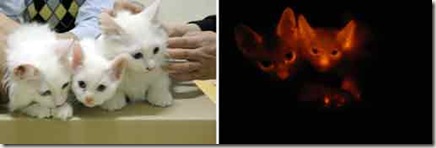 La proteína fluorescente llegó a sus cuerpos clonados gracias al trabajo de ingeniería genética que realizaron los científicos sobre el material que tomaron del padre, un siamés turco de color blanco.