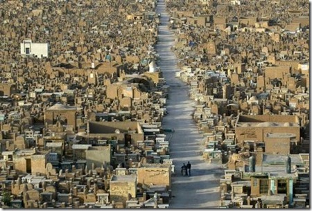 El cementerio cubre 6 km2 y contiene aproximadamente 5 millones de cuerpos. Se trata del Wadi Al-Salam ubicado en Irak, el cual esta catalogado como el cementerio Islámico más grande el mundo, probablemente también sea el mas grande del mundo también... lo que si es seguro es que es uno de los mas grandes del mundo. Vean en la tercera foto como parece no tener fin!