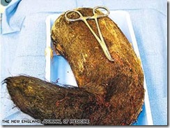 Es un caso muy curioso de una chica que comía su propio cabello,. situación alimenticia que la traiciono cuando su estómago se vio obstruido por completo con una gran bola de cabello :S